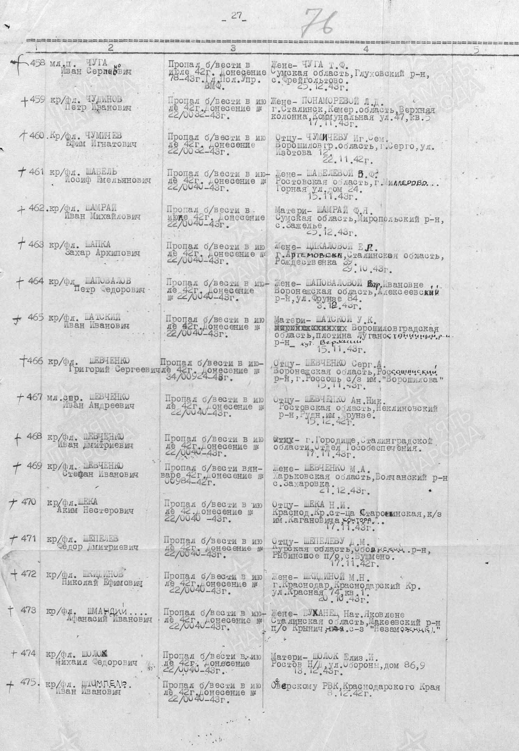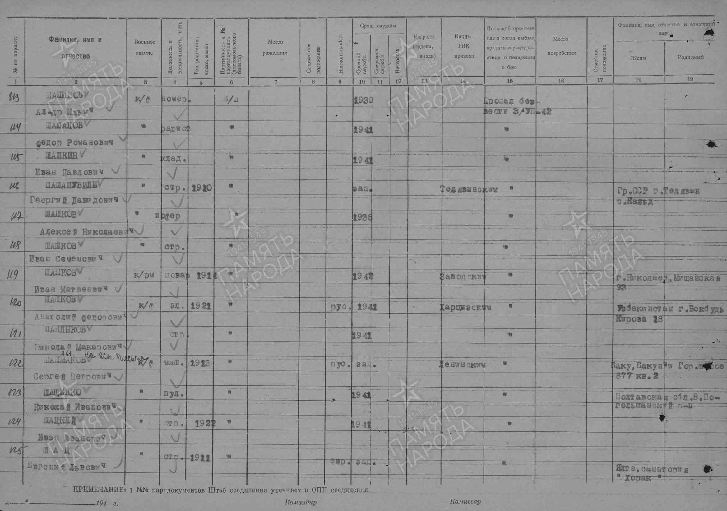 Дополнительно: 08.06.1942 попал в плен (освобожден). 21.04.1945 погиб. Первичное место захоронения: Чехословакия, с. Несвачилка. Медаль «За отвагу» 31.01.1945, Орден Отечественной войны II степени 21.05.1945 (посмертно)
