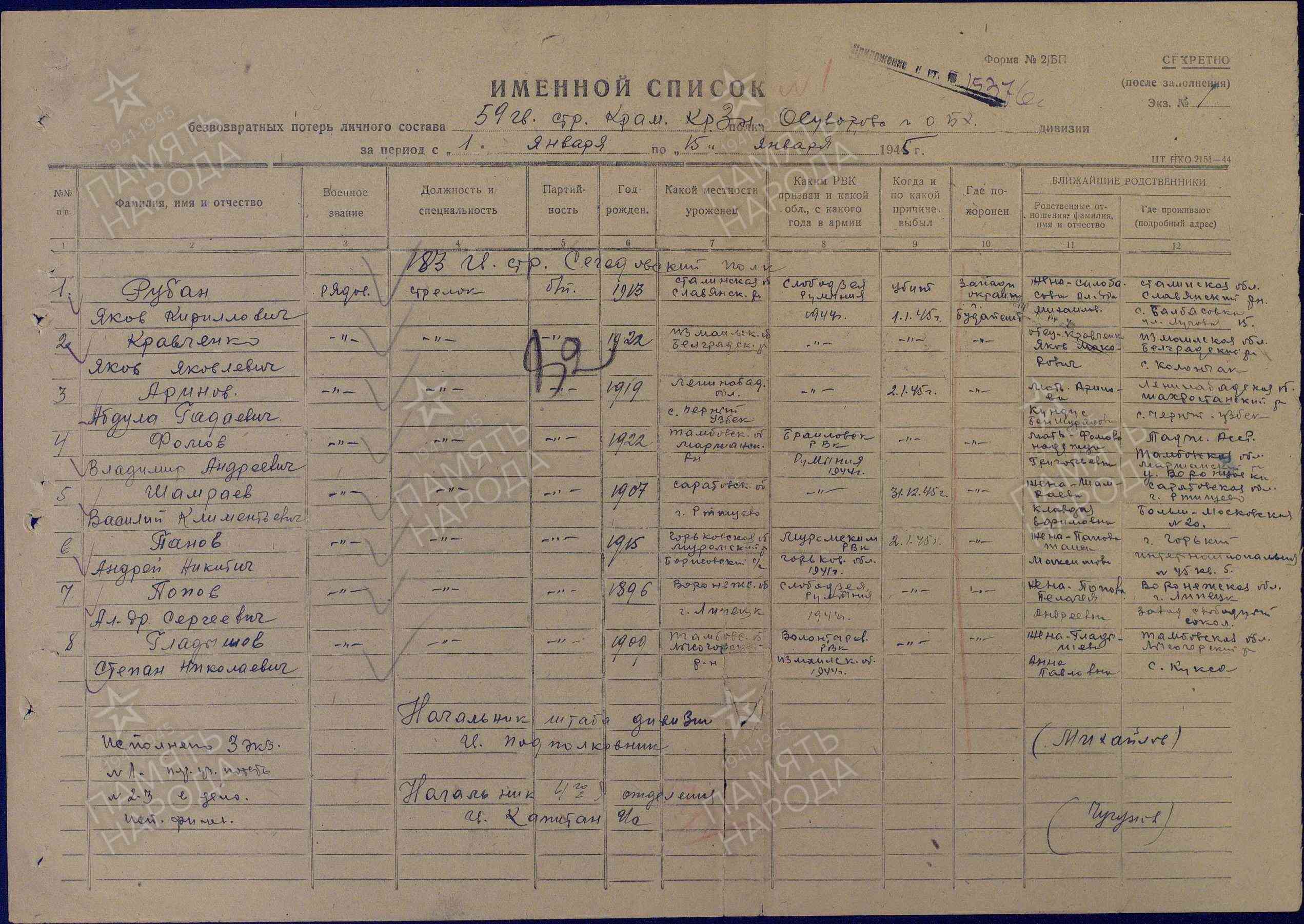 Дополнительно:Попал в плен (освобожден). 31.12.1945 погиб. Первичное место захоронения: Венгрия, г. Будапешт, западная окраина. Медаль «За отвагу» 17.01.1945
