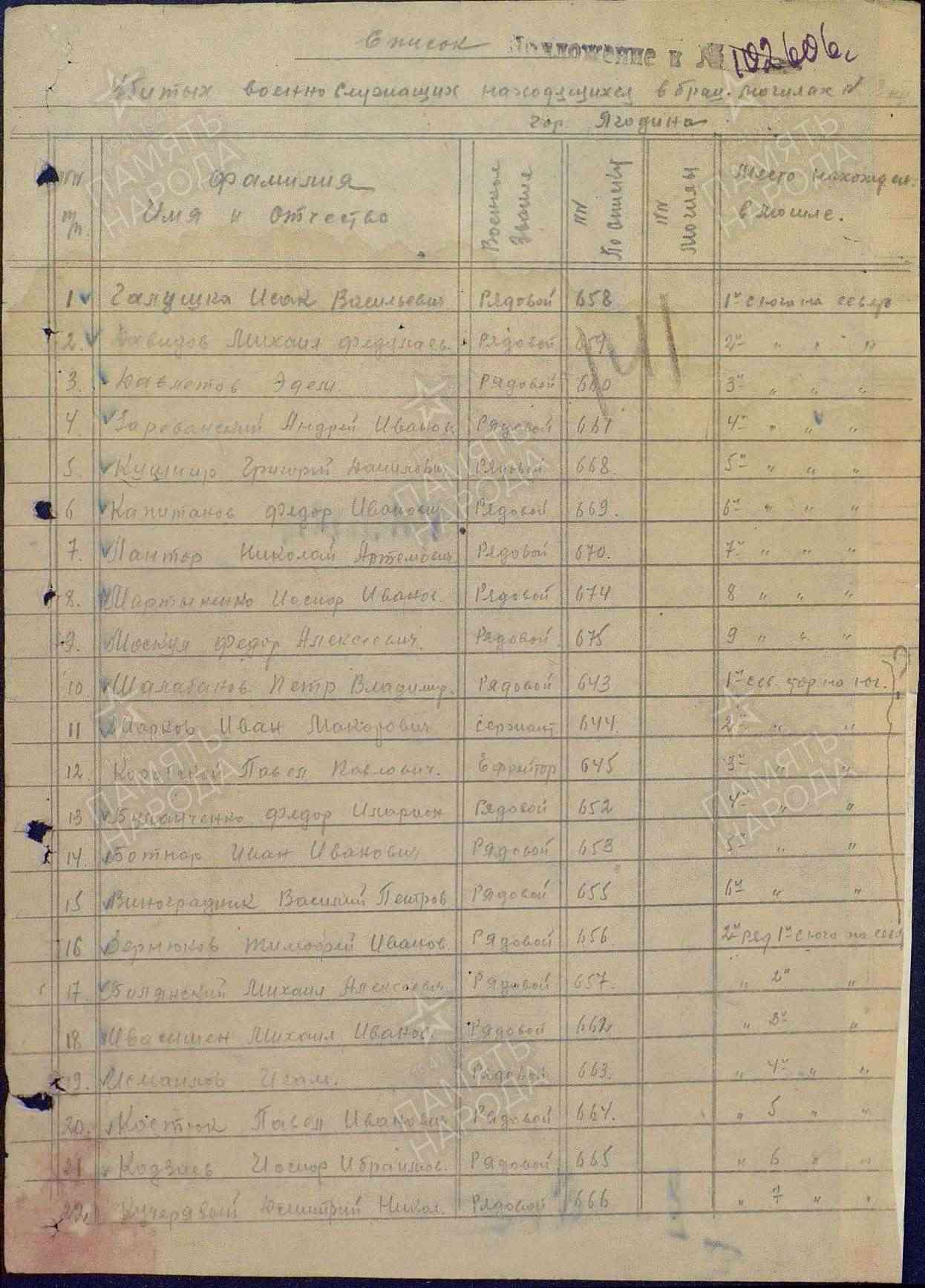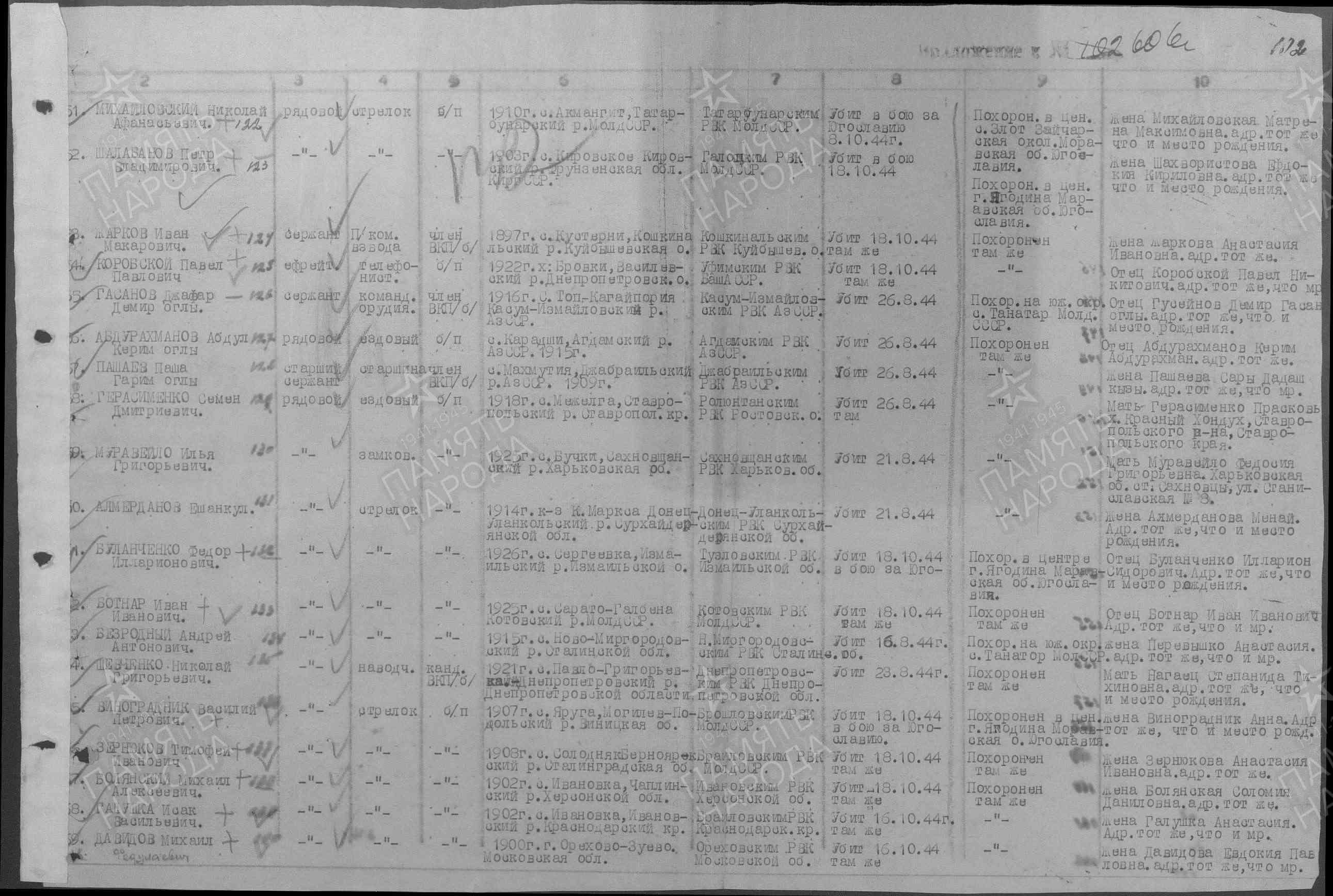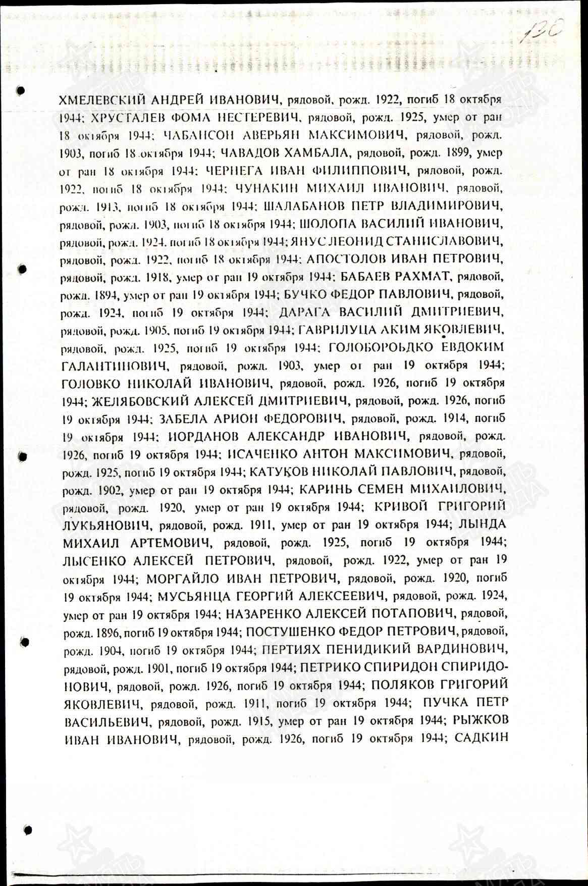 Дополнительно: Попал в плен (освобожден). 18.10.1944 погиб. Первичное место захоронения: Югославия, Моравская обл., г. Ягодина, братская могила, 1-й в могиле с северной стороны на юг. Страна захоронения: Сербия. Место захоронения: Поморавский окр., г. Ягодина (быв. Светозарево), парк. Откуда перезахоронен: Ягодина