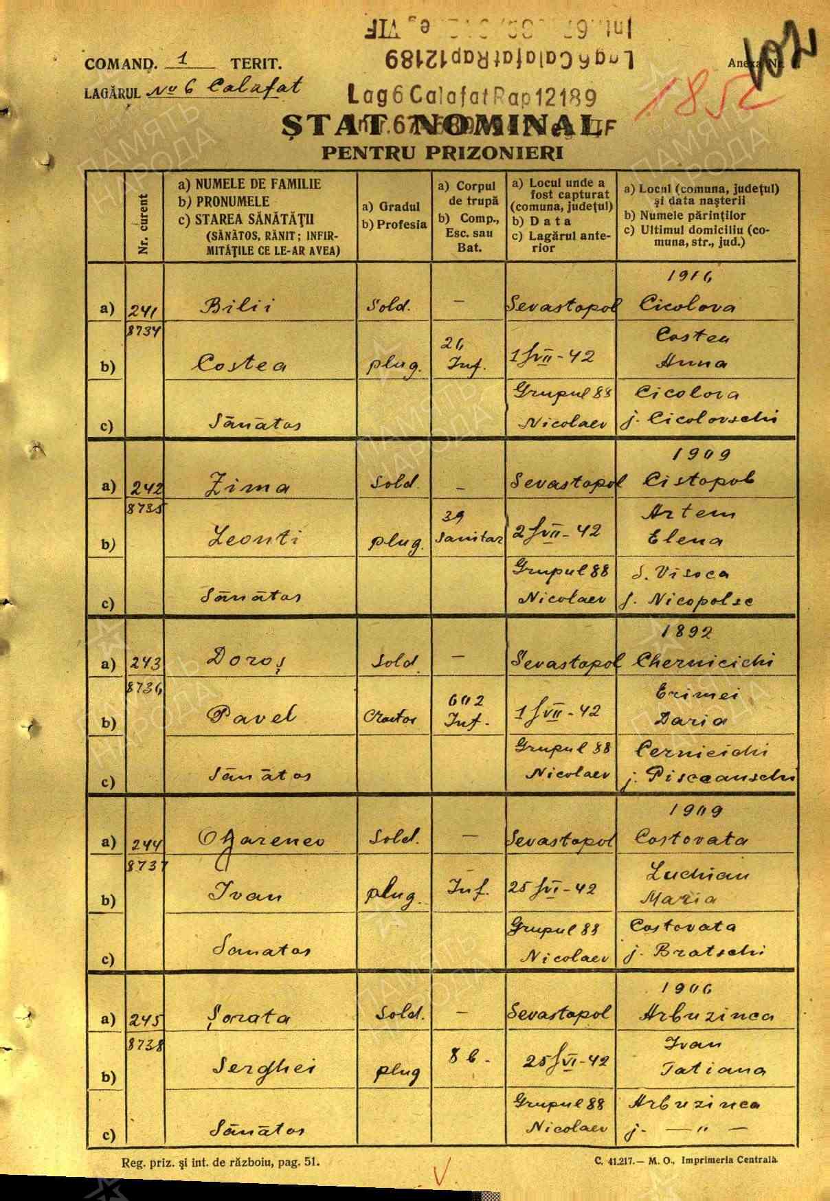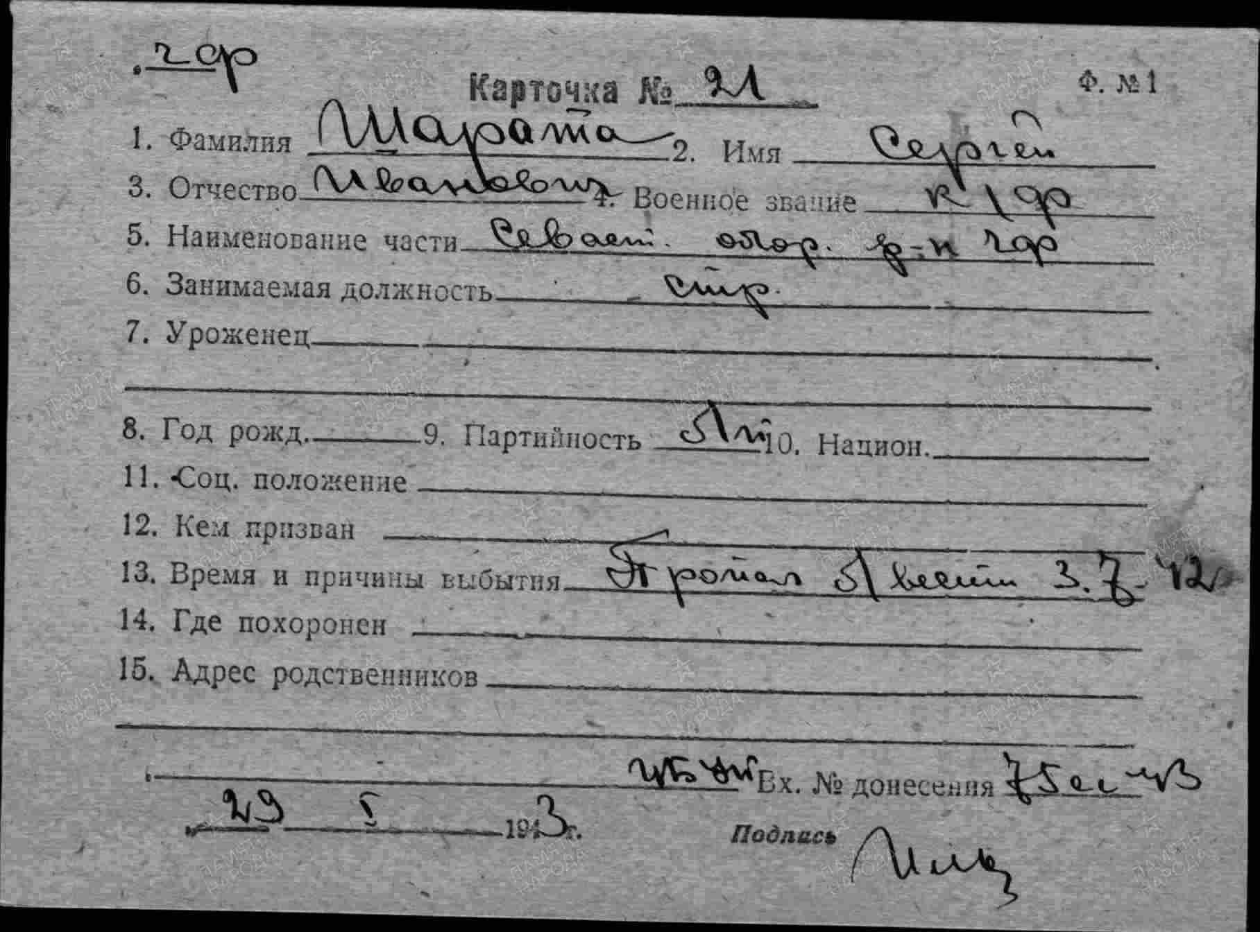 Место призыва: Арбузинский РВК, Украинская ССР, Одесская обл., Арбузинский р-н