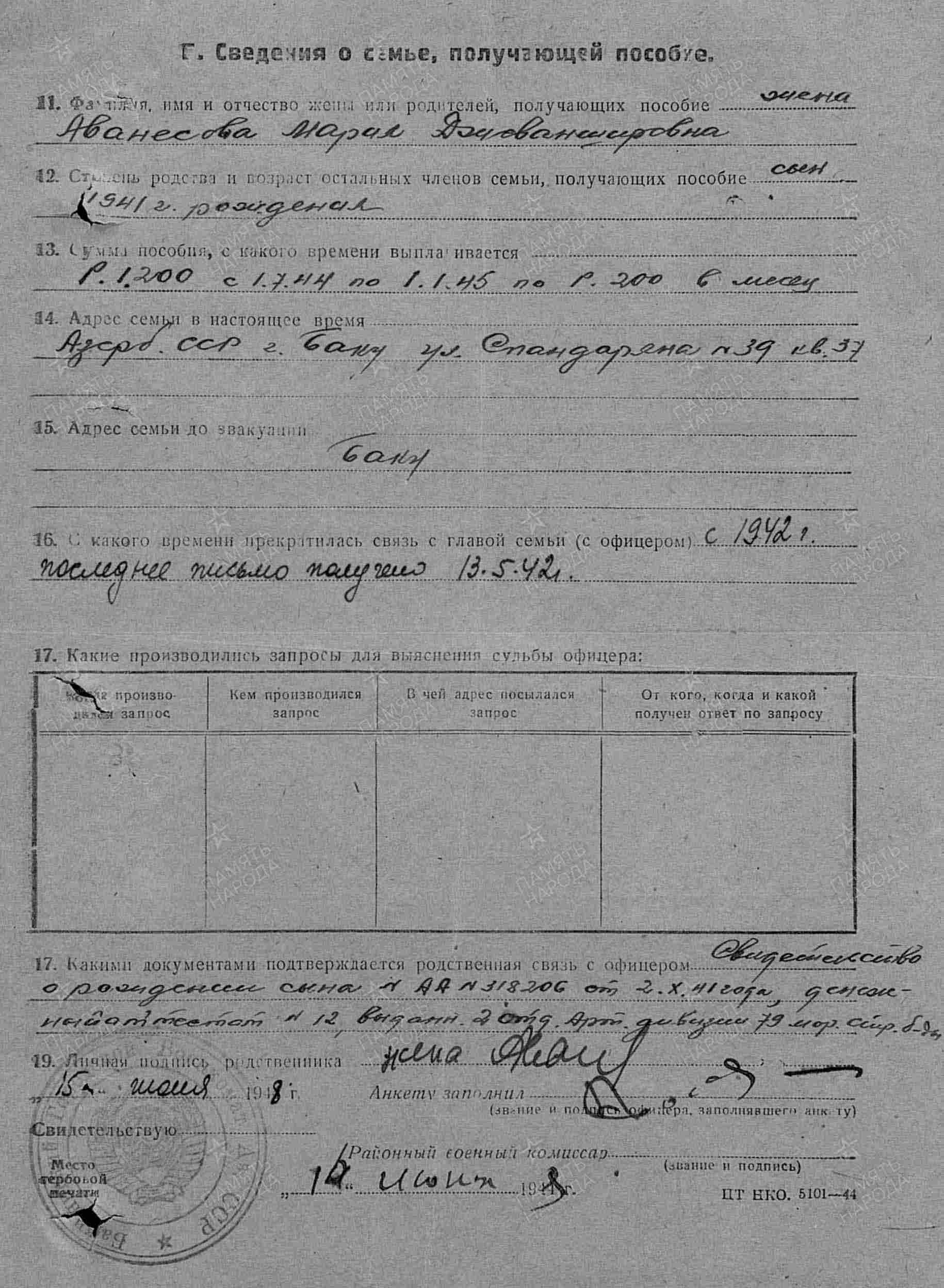 Место призыва: Городской РВК, Азербайджанская ССР, г. Баку, Городской р-н (Дивичинский РВК, Азербайджанская ССР, Дивичинский р-н)