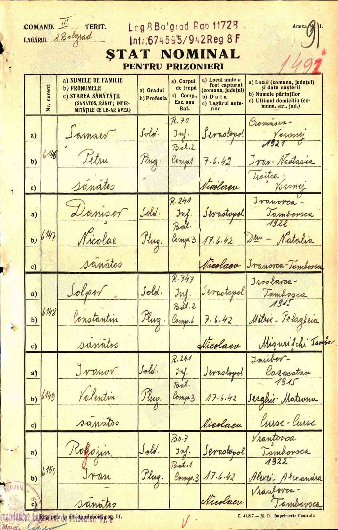 Дополнительно: Попал в плен (освобожден). 07.04.1945 погиб.Место выбытия: Югославия, Братонци. Первичное место захоронения: Венгрия, варм. Зала, г. Дильнилентово